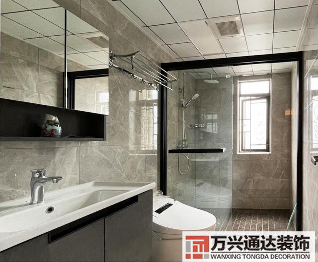 卫生间内部打造成淋浴区,地板做了防滑处理,外侧地面和墙面都用瓷砖打造,更为光滑整洁。外侧配备了洗漱池和坐便区,台下盆的设计没有卫生死角,墙上配备了镜柜能够同时拥有梳妆打扮和物品收纳的功能。