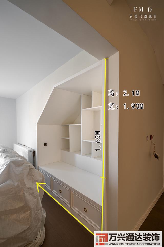 都知道斜顶是阁楼最鸡肋的一点,但是不代表没有方法利用起来,既然这里不方便站人,那就改成储物空间。这里的斜墙处于非承重墙,刚好可以利用这个特征将柜子做成内嵌式的,不占地也能将这面墙充分应用起来。