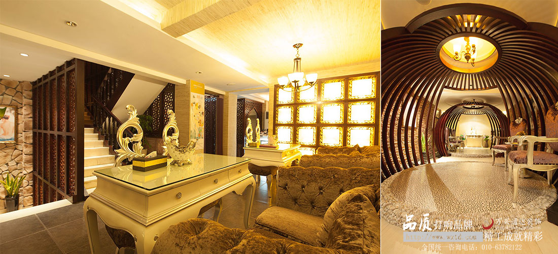 设计说明:本案例的设计以尊贵·典雅、品味为主题,体现了美容院现代时尚的文化。在平面布局上,分为四个区域:门厅、接待、男宾和女宾。