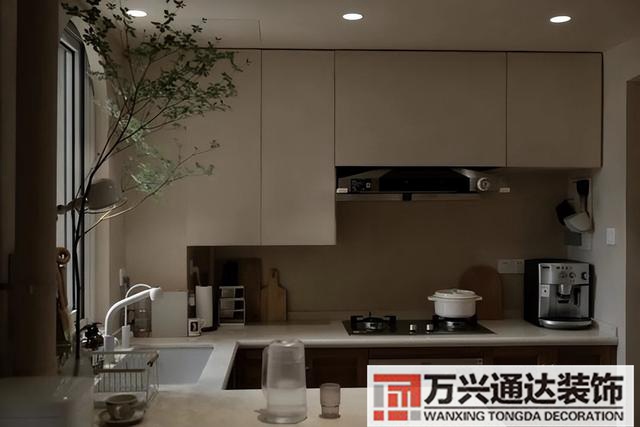 厨房吊柜与顶面色系相同,减少空间压抑感,吊柜采用按压式设计,让视觉更为统一。