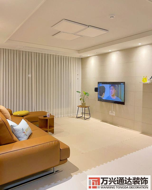 客厅空间比较简单,没有多少物品,只有简单的电视、沙发和茶几布局,东西越少反而显得更加精致。深橘色沙发和暖色系的瓷砖搭配,又复古又干净。摒弃满墙柜体,挂放电视,并给旁边墙面安排一个置物架就搞定。